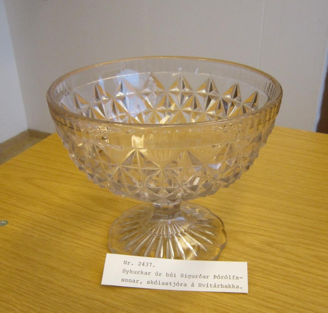 Úr eigu Sigurðar Þórólfssonar, skólastjóra Hvítárbakkaskóla, en hann var faðir gefanda. Þetta er eini hluturinn, sem eftir var á Hvítárbakka úr búi Eggerts Eiríkssonar (síðar á Grjóti í Þverárhlið og í Borgarnesi), þegar Sigurður Þórólfsson tók við Hvítárbakka. Sykurkarið var alltaf haft fullt af molasykri, meðan það var á Hvíárbakka, en eftir að Sigurður flutti til Reykjavíkur notaði Ásdís kona hans það til að bera fram í því kleinur.