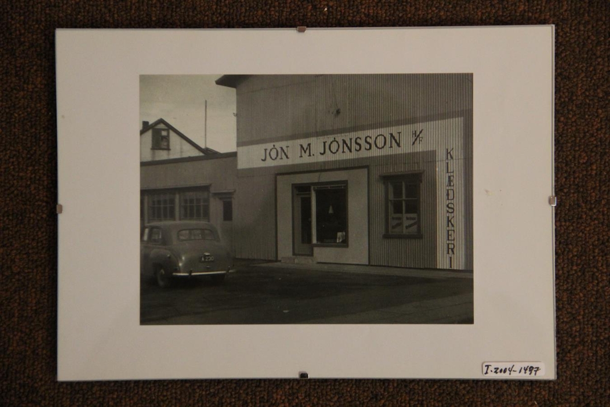 Ljósmynd af húsi sem hýsti Fatagerð og verslun Jóns M. Jónssonar hf. klæðskera. Á húsinu, sem var að Strandgötu 7 Akureyri, stendur Jón M. Jónsson klæðskeri. Á myndinni má sjá bílnúmerið A - 230. Það númer er enn í eigu fjölskyldunnar.