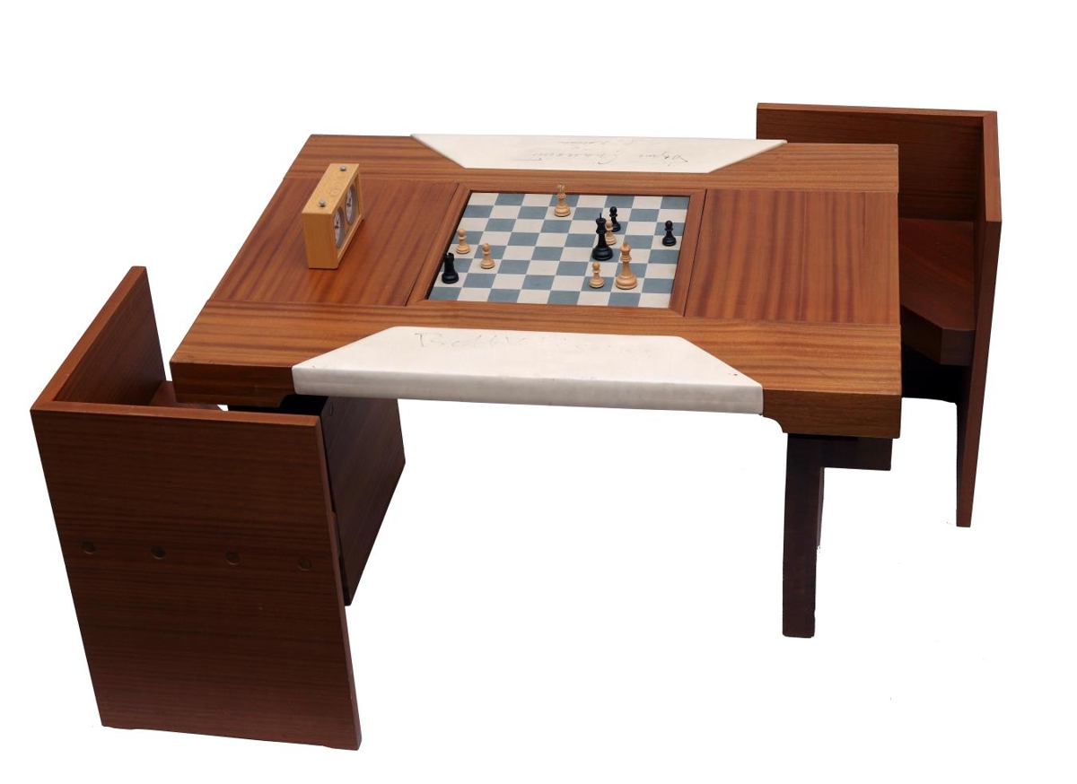 Skákborðið frá heimsmeistaraeinvíginu í Laugardalshöll 1972, ásamt tveimur hliðarborðum.