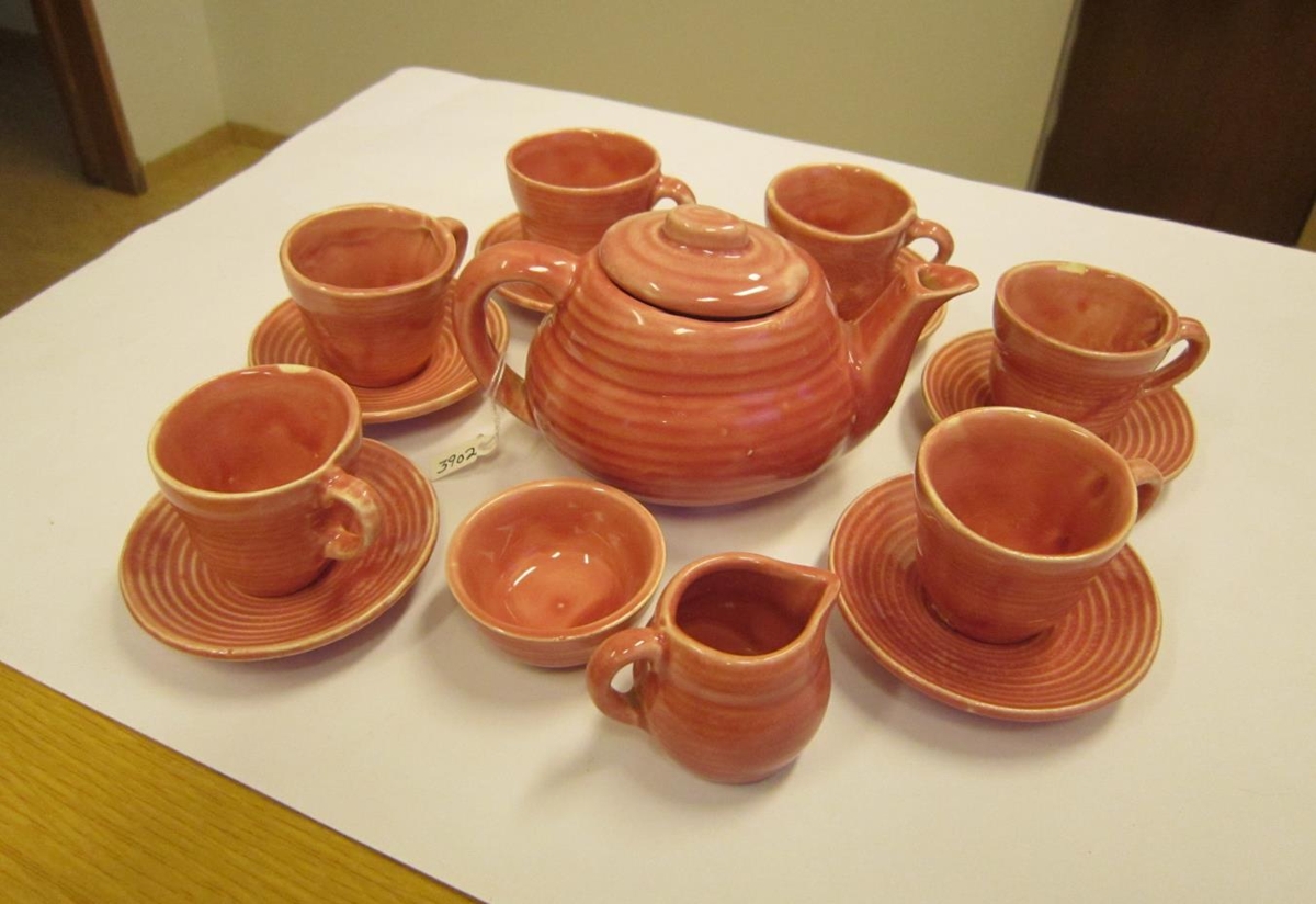 Bollastell, 6 bollar, undirskálar, teketill, lok, rjómakanna og sykurkar eru skráð undir nr. 3901 og 3902. Stellið er lítið (brúðustell), bleikt úr leir.