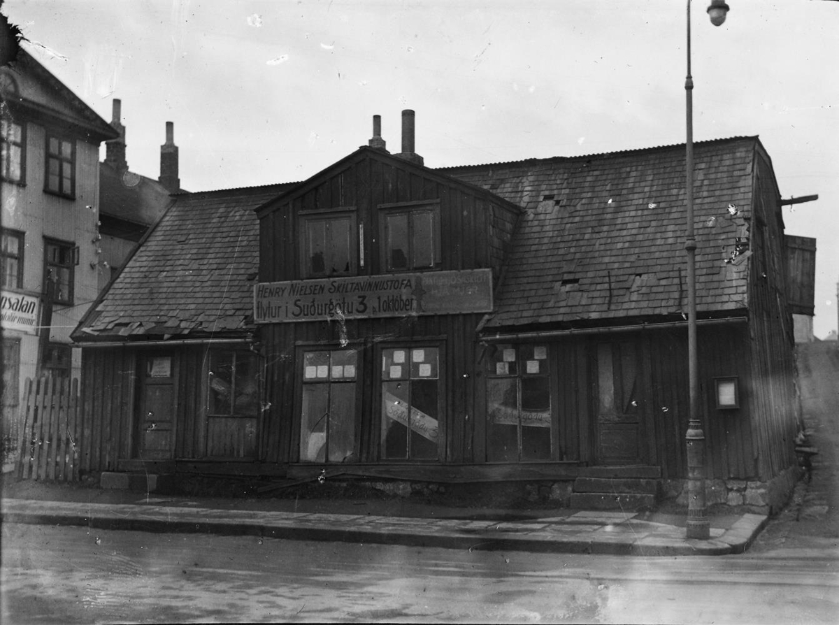 Timburhús með miðjukvisti og skífuþaki. Frama á því er skilti með áletruninni Henry Nielsen skiltavinnustofa flytur í Suðurgötu 31. október.