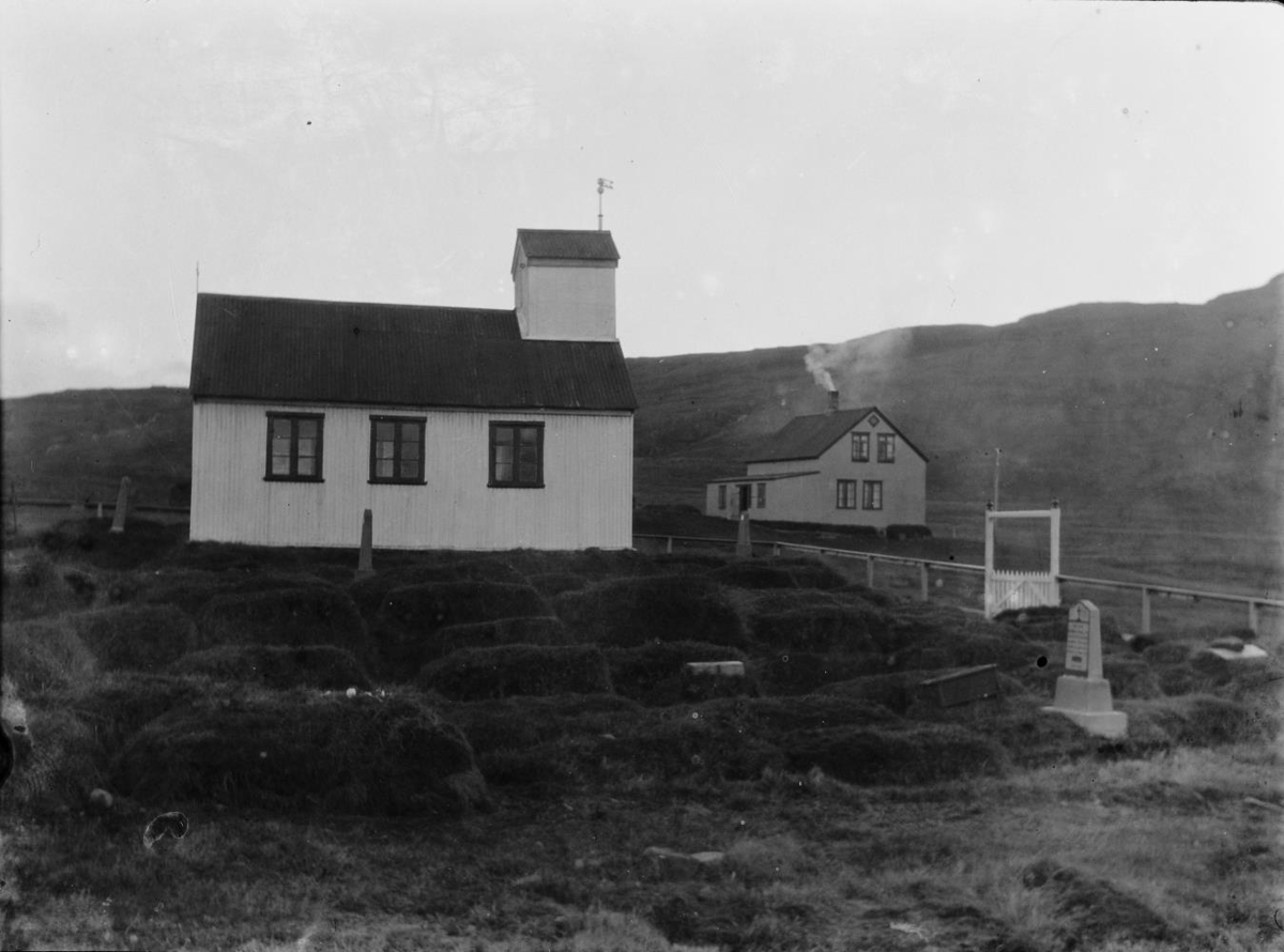 Bárujárnsklædd kirkja með turni, kirkjugarður í forgrunni með uppbyggðum gröfum og minningarmarki. Íbúðarhús fjær.
