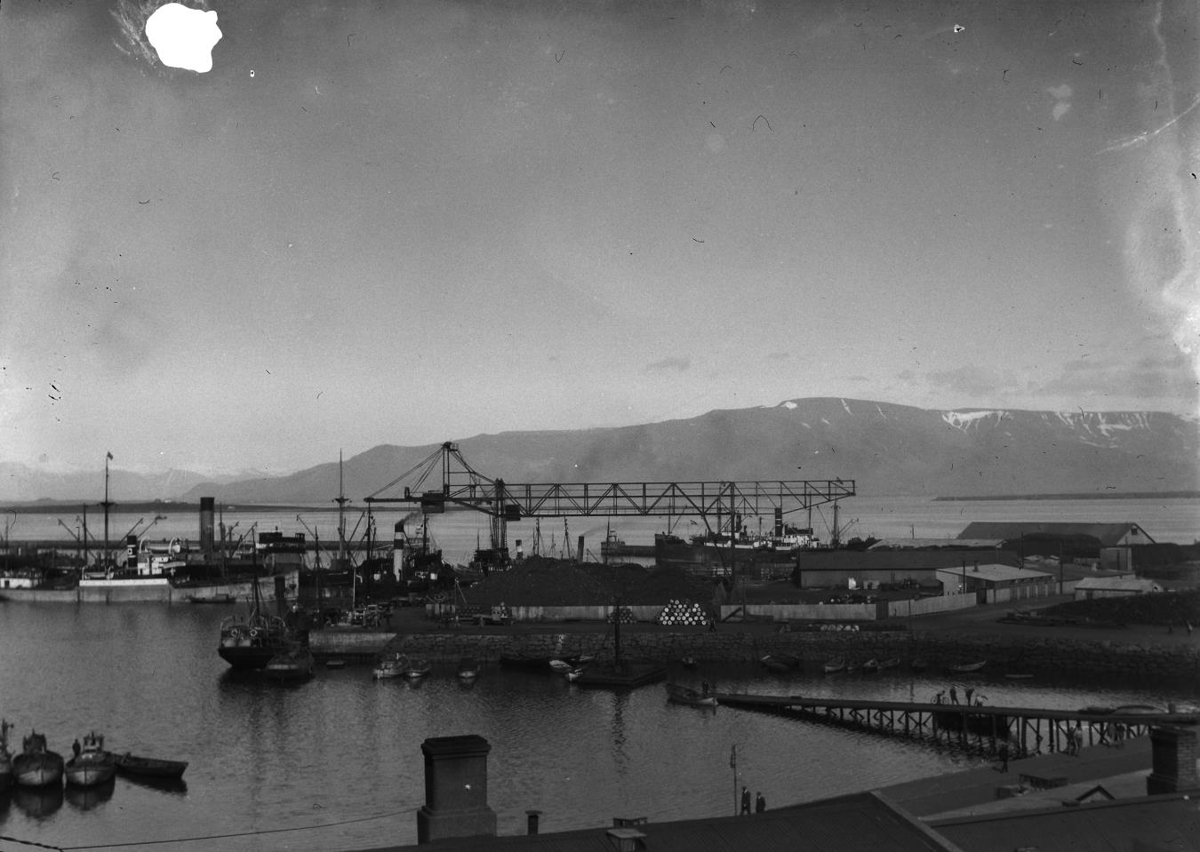 Sér yfir hluta af hafnarsvæði með bryggjum og skipum og kolakrani gnæfir yfir.