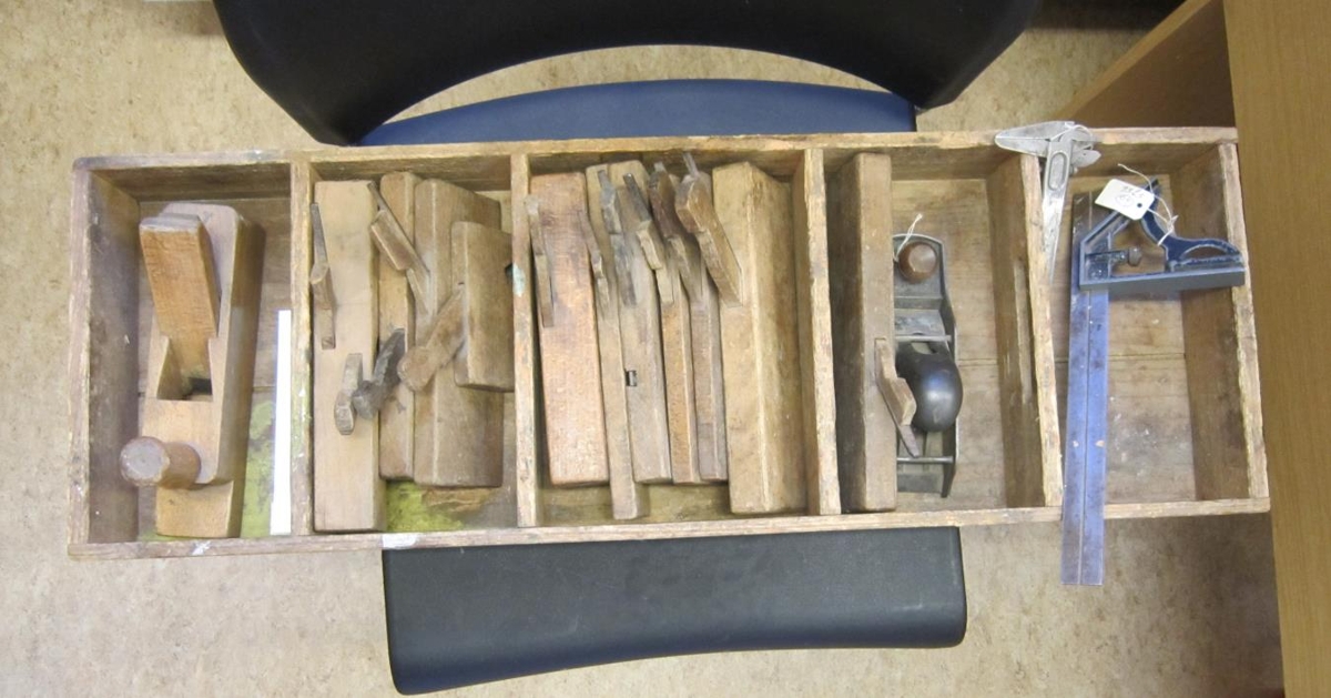 Úr eigu Þórarins Ólafssonar, f. 10/5, 1885, d.19/5, 1947, trésmiðs í Borgarnesi. Hann var frá Einifelli í Stafholtstungum, lærði trésmíði í Borgarnesi og fór síðan burt um tíma. Að fáum árum liðnum kom hann aftur, settist að í Borgarnesi og var um áratuga skeið einn helsti húsasmiður Borgnesinga á fyrra helmingi 20. aldar. Í bókinni, Hundrað ár í Borgarnesi, fær Þórarinn eftirfarandi einkunn: “Hann var afburðamaður á sínu sviði, áhlaupamaður mikill og ótrauður í hverri raun”. Gef. Tyrfingur Þórarinsson f. 27/12, 1916. Í kassanum eru núna heimasmíðaðir heflar Þórðar Jónssonar á Mófellsstöðum.