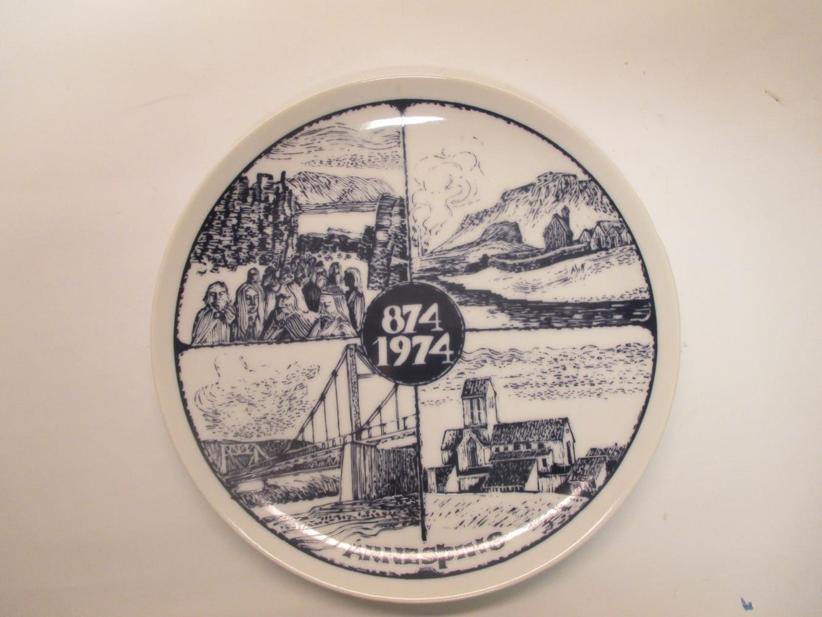 Platti með ámáluðum myndum og áletrunum. Hvítur platti með dökkbláu letri. Plattinn var gerður árið 1974 í tilefni 1100 ára afmælis Íslandsbyggðar. Á plattanum eru ártölin 874 og 1974, neðst stendur Árnesþing. Teikningarnar sem eru eftir Gísla Sigurðsson frá Úthlíð sýna Þingvelli, Haukadal, Selfoss (Ölfusárbrú) og Skálholt.