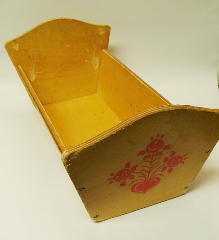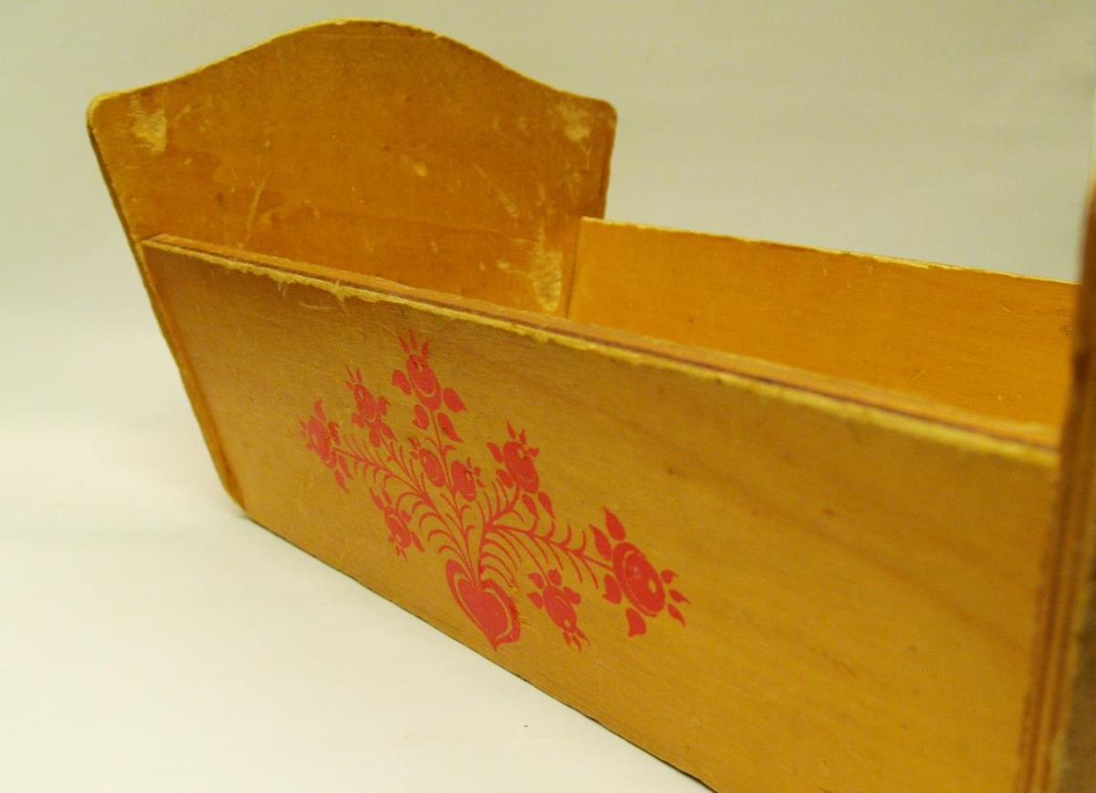 Ljósleitt dúkkurúm úr viðarplötu. Rautt ámálað blómamynstur er á hliðum og göflum. Botninn í rúminu liggur í rauf og hliðar eru áskrúfaðar í gafli. Rúmið er hluti af heimasmíðuðum leikföngum leikskólans Brimvers frá upphafsárum hans. Það sést töluvert mikið á rúminu þar sem fjölmörg börn hafa leikið með það.