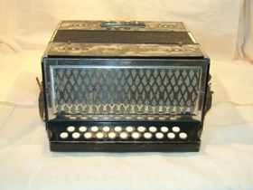 Grá 2 raða díatónísk hnappaharmonika af gerðinni HOHNER, 21 nóta í diskant og 8 í bassa. Framleidd í Þýskalandi. Harmonikan kom í viðgerð til Jóhannesar Jóhannessonar árið 1944. Eigandi hennar þá var skipstjóri frá Vestfjörðum sem flutti til Reykjavíkur. Að beiðni eigandans seldi Jóhannes harmonikuna til greiðslu á viðgerðinni. Gefandi keypti harmonikuna og gaf föður sínum, Jóni Guðbrandssyni, bónda á Saurbæ, en hann hafði spilað á harmoniku áður. Eftir lát Jóns fór harmonikan á flakk, en fannst fyrir tilviljun í Reykjavík nú fyrir skömmu.