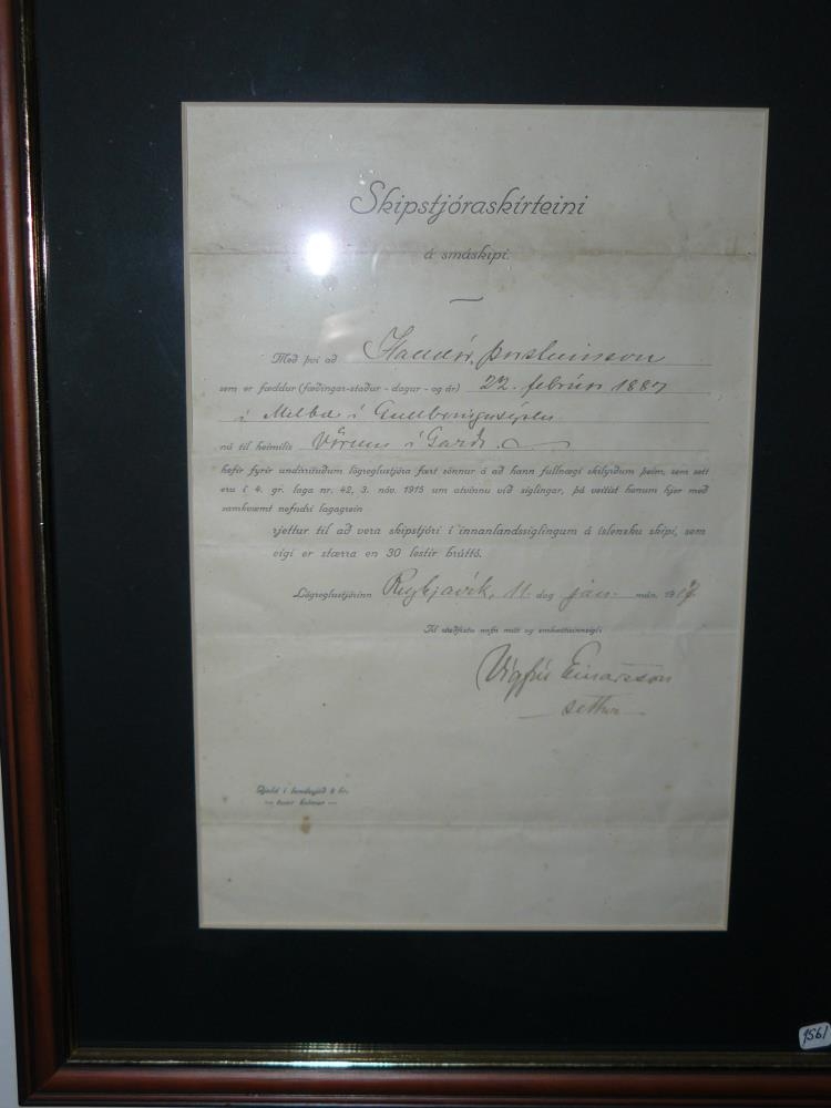 Skipsstjórnarskírteini Halldórs Þorsteinssonar (1887 - 1980) útvegsbónda frá Vörum í Garði. Skírteinið var gefið út 11. janúar árið 1917. Halldór hafði með því "rétt til að vera skipstjóri í innanlandssiglingum á íslensku skipi, sem eigi er stærra en 30 lestir brúttó" eins og segir í skjalinu.