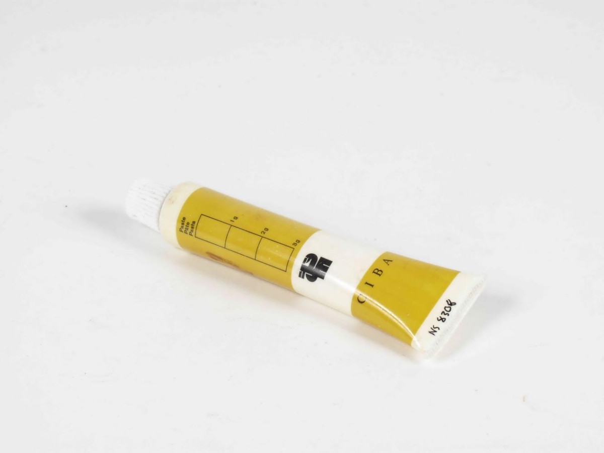 Í túpu. Á henni stendur: Paste / Pâte / Pasta / CIBA.