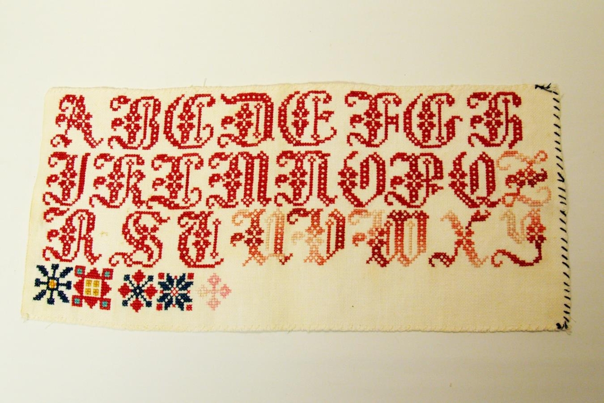 Stafaklútur með stafrófinu, rautt letur, hvítur bakgrunnur. Frá Einarshöfn á Eyrarbakka.