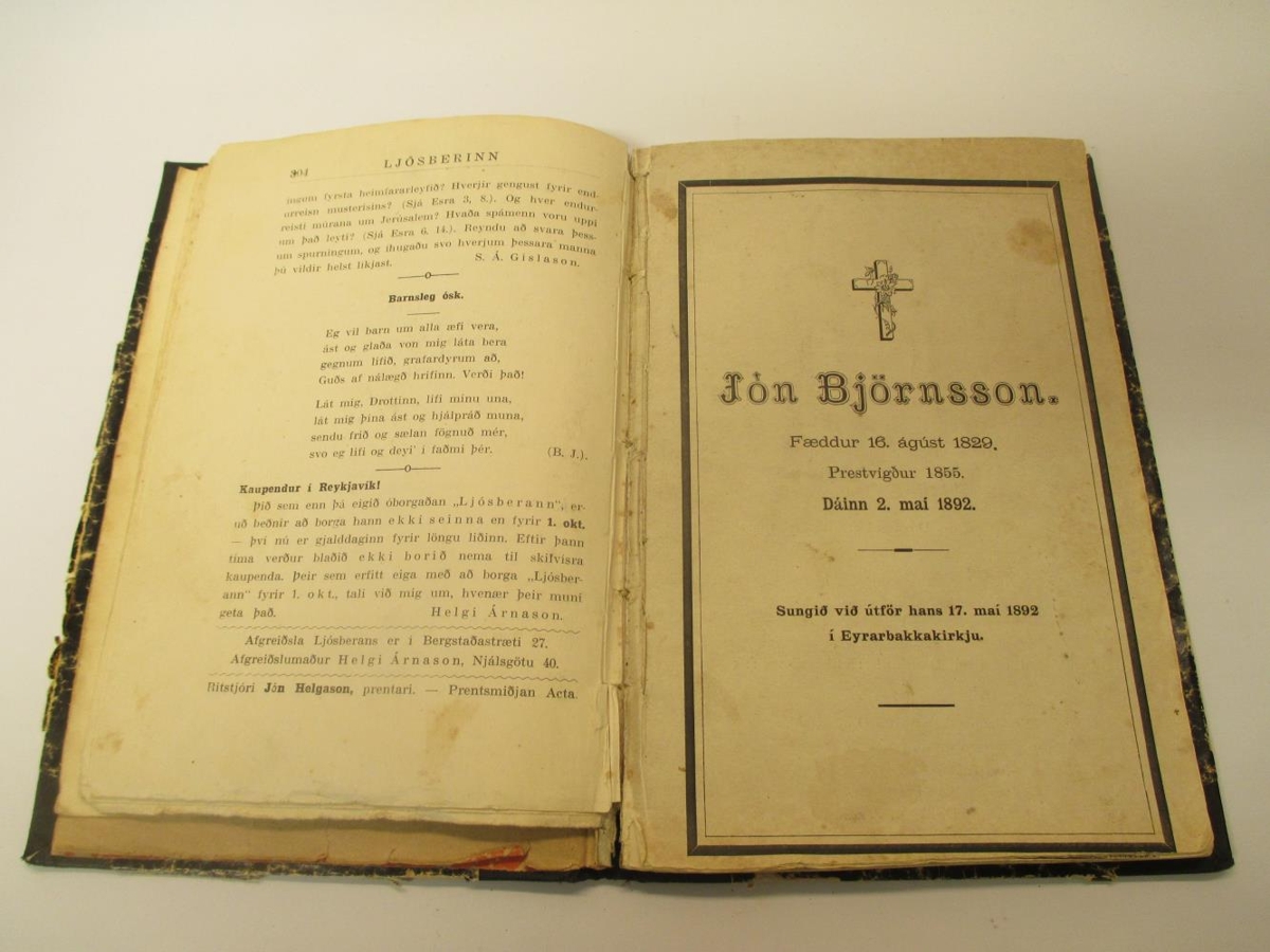Innbundin bók með bæklingum eins og "Andatrúin afhjúpuð", "Æskugaman" og "Ljósberinn". Tvær ljósmyndir eru í bókinni lausar, önnur af Holti undir Eyjafjöllum og hin af Sigurjóni Ólafssyni síðar myndhöggvara með tekiningum sínum í barnaskólanum á Eyrarbakka. Að lokum eru nokkrar sálmaskrár um þekkta Eyrbekkinga. Ingibjörg Jakobsdóttir er sennilega eigandi þessarar bókar. Frá Einarshöfn á Eyrarbakka.