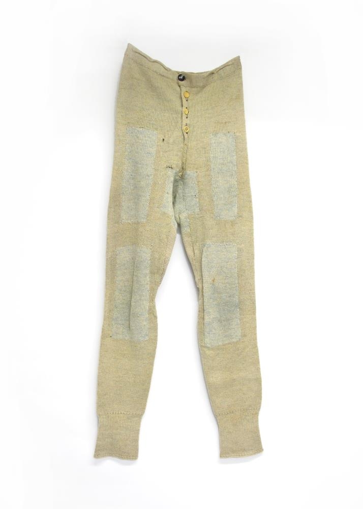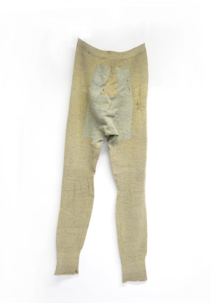 Síðar karlmannsnærbuxur, föðurland, vélprjónað og virðist geta verið útlent (ekki úr íslenskri ull). Því er hneppt að framan með fjórum tölum, hverri af sinni gerð. Föðurlandið er augljóslega mjög mikið notað. Það hefur gatslitnað mjög víða og margsinnis hefur verið gert við það. Það eru einmitt þessar viðgerðir, sem sumar hverjar eru listilega vel gerðar, sem gera þennan grip svo áhugaverðan. Föðurlandið barst með öðrum fatnaði til Hjálparstarfs kirkjunnar en ekki er vitað hvaðan.