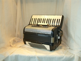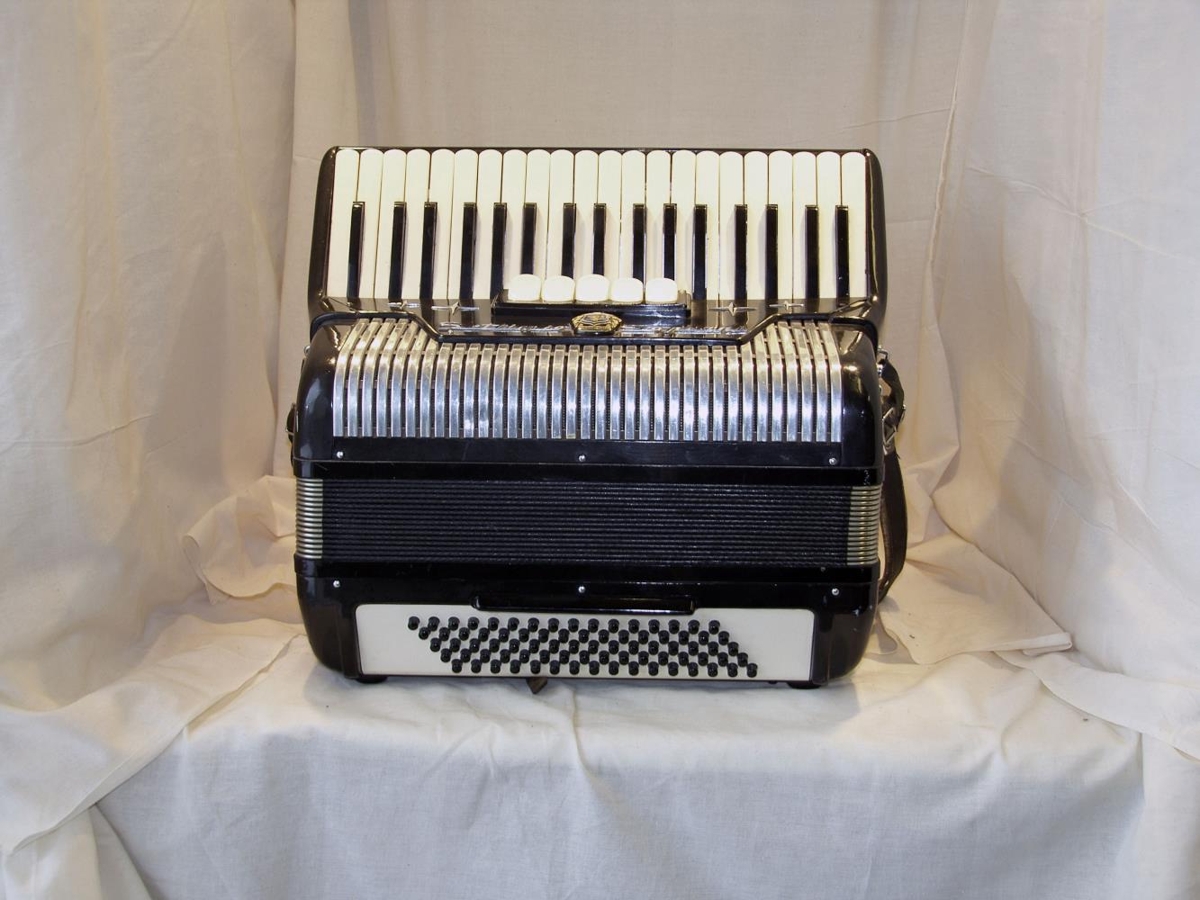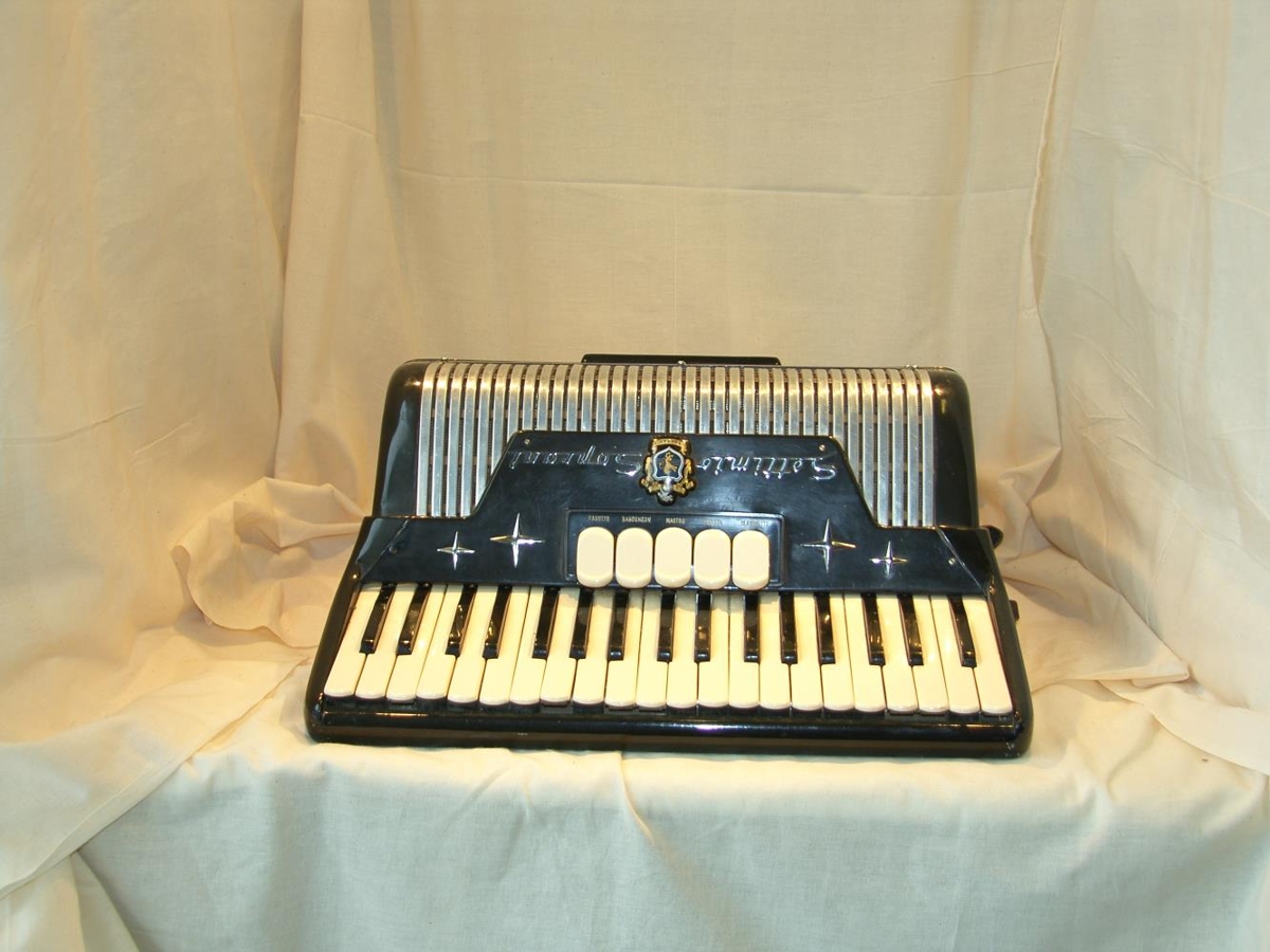 Svört píanóharmonika af gerðinni SETTIMIO SOPRANI, 37 nótur í diskant og 80 í bassa, 3 kórar og 5 skiptingar. Framleidd á Ítalíu. Ragnar eignaðist harmonikuna notaða árið 1957. (ath)