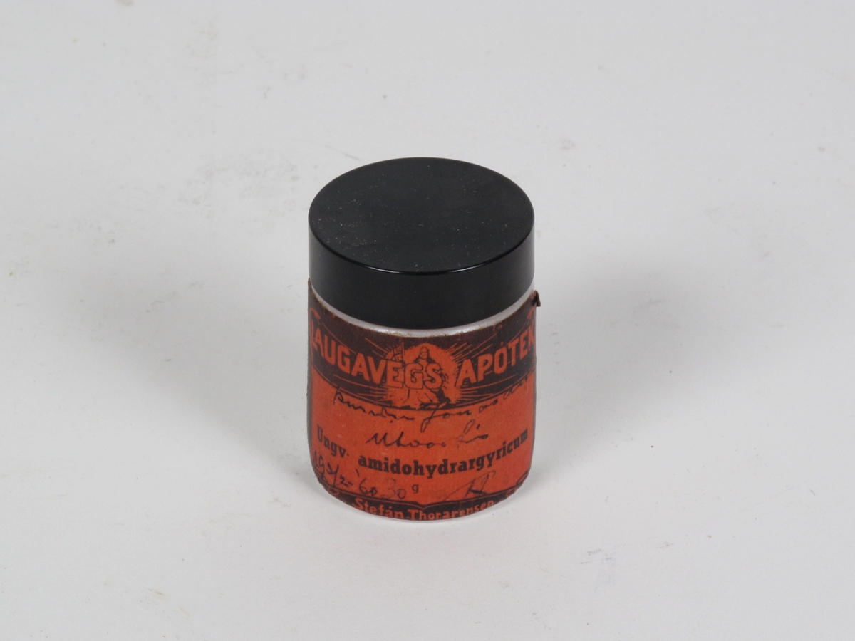 Hvít krukka með plastloki. Merking: Ungv. amidohydrargyrium. Það er eitthvað handskrifað sem ég skil ekki.-LMS.