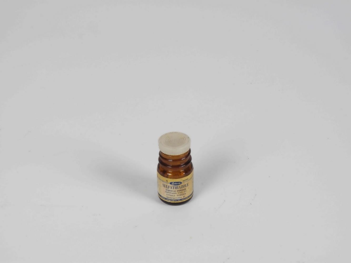 Brúnt lyfjaglas. Merking: Sulfathiazole / Surgical powder.