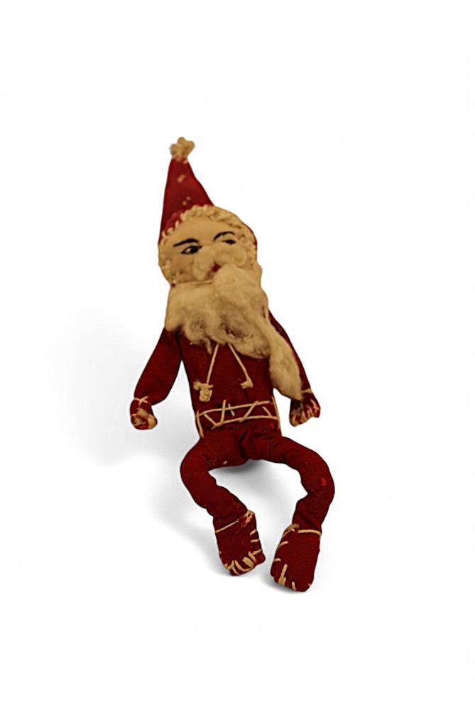 Heimagerður og handsaumaður jólasveinn í rauðum léreftsfötum með rauða húfu.Skegg úr bómull, andlit úr lérefti, augu ásaumuð.