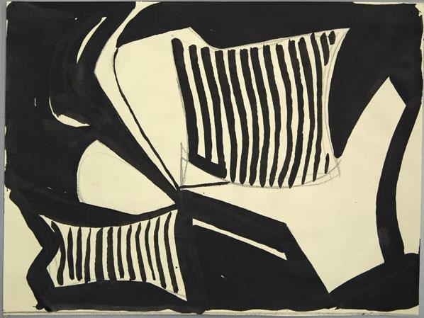 Blý og blekteikning á ljósan pappír - teiknað upp með blýi, málað ofan í með bleki. Þekja bleksins jöfn - örlítill gljái. Bakgrunnur dökkur 5 ljós form, 2 form með lóðréttum línum. Vinstri og neðri hlið skornar til.