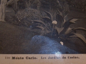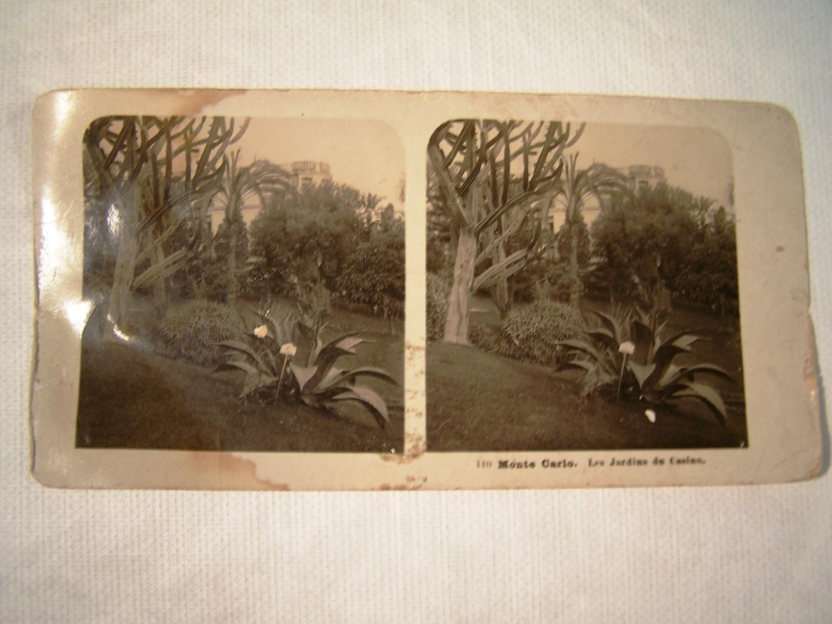 Mynd í stereoscop. Af kaktusum og öðrum plöntum. Hús í baksýn. Undir mynd stendur: 110 Monte Carlo. Les Jardins du Casino.