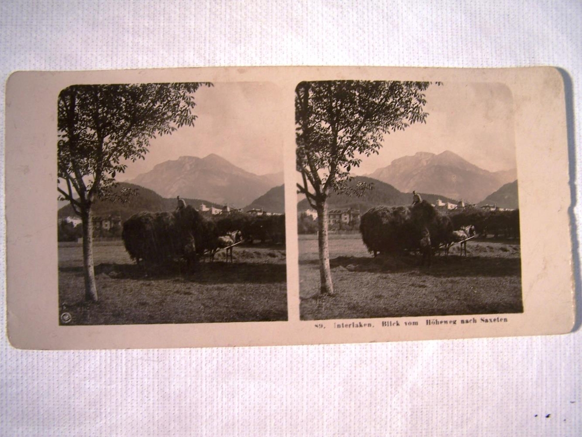 Mynd í stereoscop. Heyskapur, hestvagn með heyi og hestur fyrir. Þorp og landslag í baksýn. Undir mynd stendur: 89. Interlaken. Blick vom Höenveg nach Saxten.