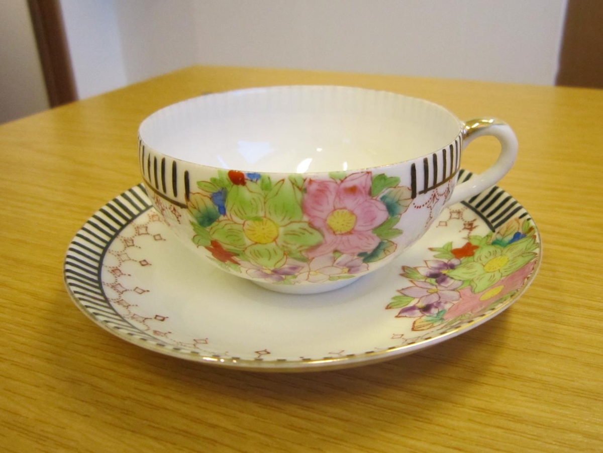 Bolli og undirskál úr þunnu kínversku postulíni með blómamyndum, svörtum bekk og gyllingu.