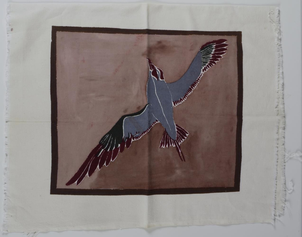 Prufa af fuglamynstri. Handþrykkt og virðist vera málað í grunninn þar sem áferð er misþykk. Ásrún var með þetta mynstur í þremur stærðum.