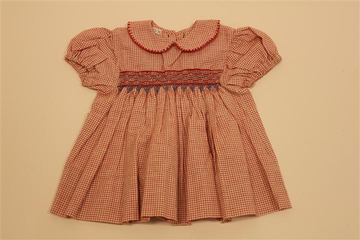 Kjóll á litla stúlku, líklegast skólaverkefni í grunnskóla eða kvennaskóla. Köflótt, rautt og hvítt bómullarefni og vöfflusaumur á brjósti.