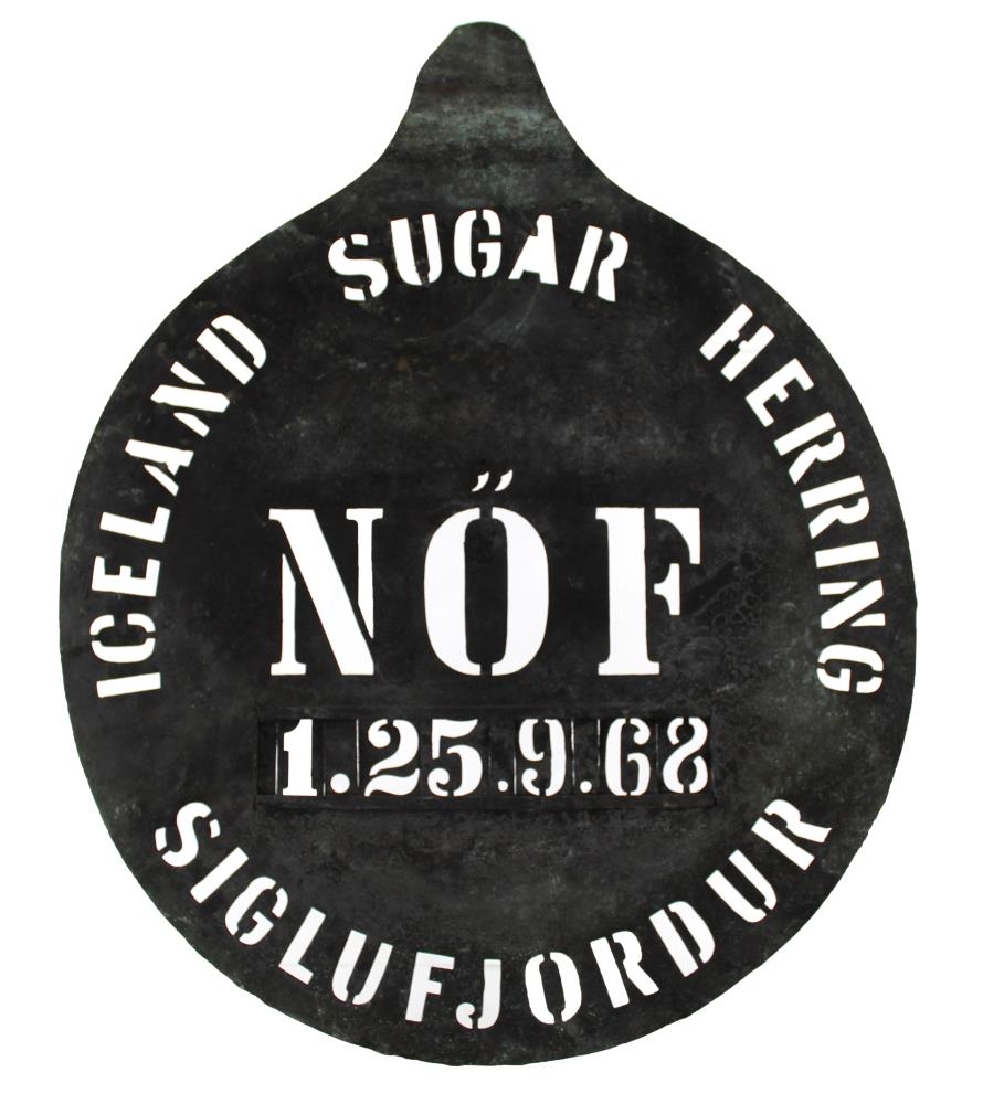 Á botnamerkinu stendur: Iceland Sugar Herring. Nöf. Siglufjörður. Á því eru einnig tölurnar: 1.25.9.68. - þ.e. 1. söltun ársins 1968 og dagsetningin er 25. september 1968.