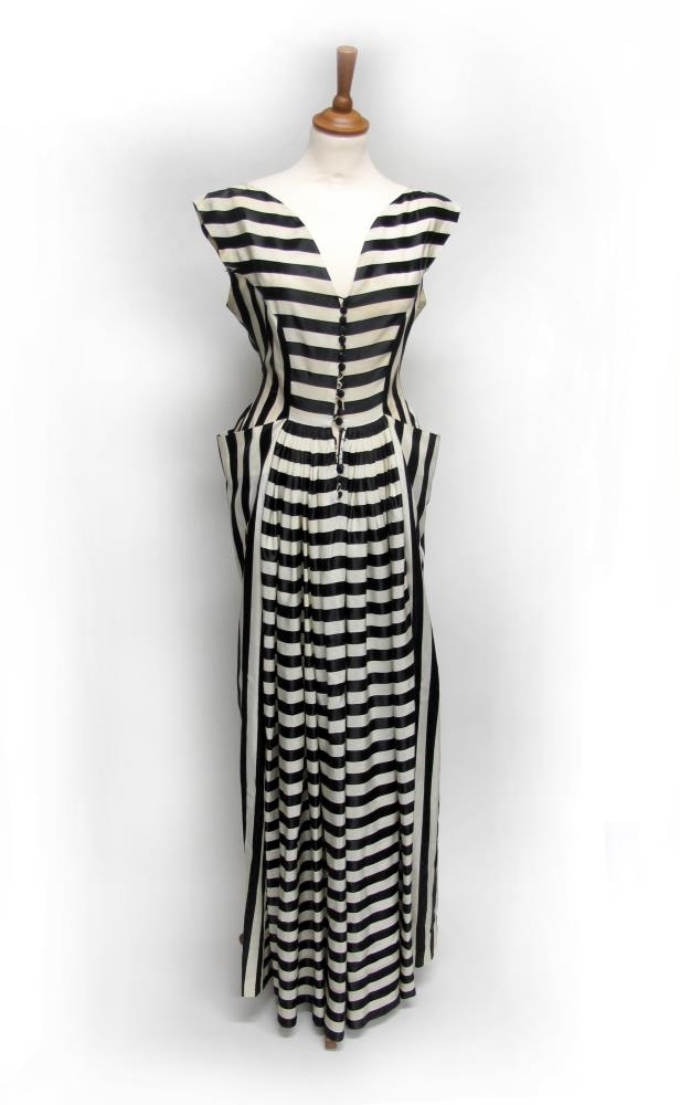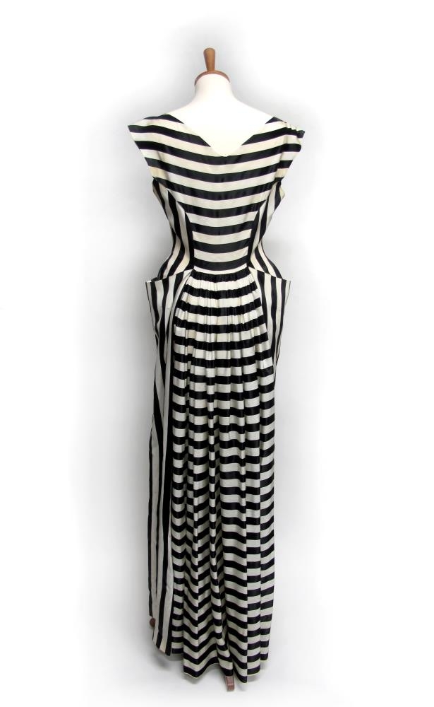 Árshátíðarkjóll úr versluninni Gullfossi, kjólaverslun Reykjavík, röndóttur, ermalaus, aðsniðinn í mittið en gengur út móts við mjaðmir. Hálsmálið er í V bæði að framan og aftan og að framanverðu er kjóllinn hnepptur með mörgum hnöppum, alveg niður að pilsi. Þó nokkrir hnappanna hafa glatast og einnig eru margar hneslanna orðnar slitnar. Í kjólnum er ennfremur eilítið um föst óhreinindi en annars er hann í nokkuð góðu ástandi.