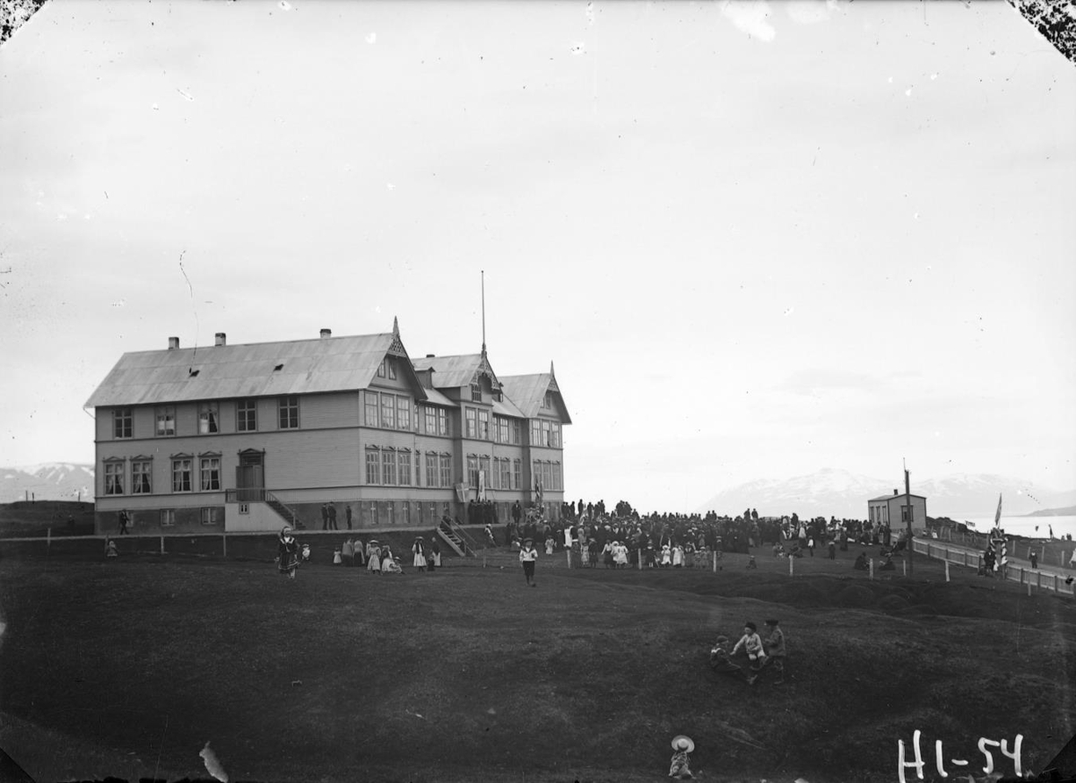Skemmtun við Gagnfræðaskólann á Akureyri nýrbyggðann. Sigtryggur Jónsson timburmeistari reisti húsið 1904-1905. Nær sér á Eyrarlandstúnið, þar sem konur gerðu Lystigarð Akureyrar árið 1912.