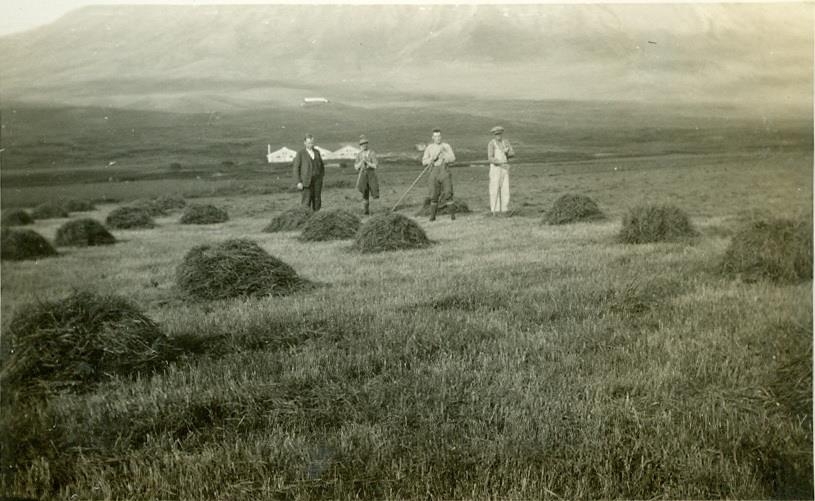 Fjórir menn á túni. Einn í jakkafötum að fylgjast með verki en þrír með hrífur og hafa verið að raka saman heyi í litlar sátur. undir myndina er skrifað Steingr., Páll, Jón og Frímann að fanga hey. Steingr. er væntalega Steingrímur Steinþórsson skólastjóri bædaskólans,