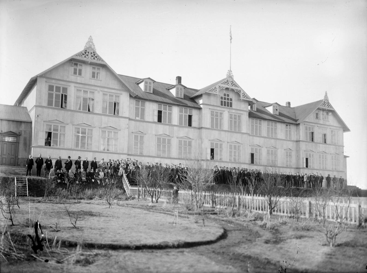 Hús Menntaskólans á Akureyri, kennslustofur, kennarastofa og heimavist upp í risi.