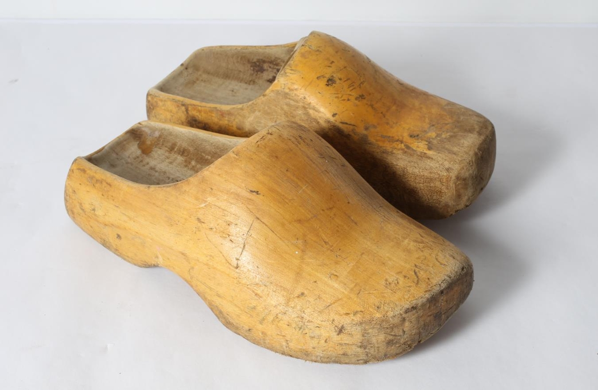 Tréklossar, gulir og illa farnir. Vinstri skórinn er komin í gat. Komu úr Keldhólabúinu þar sem Jón, Salný Jónsdóttir og Kristin Eiriksson áttu.