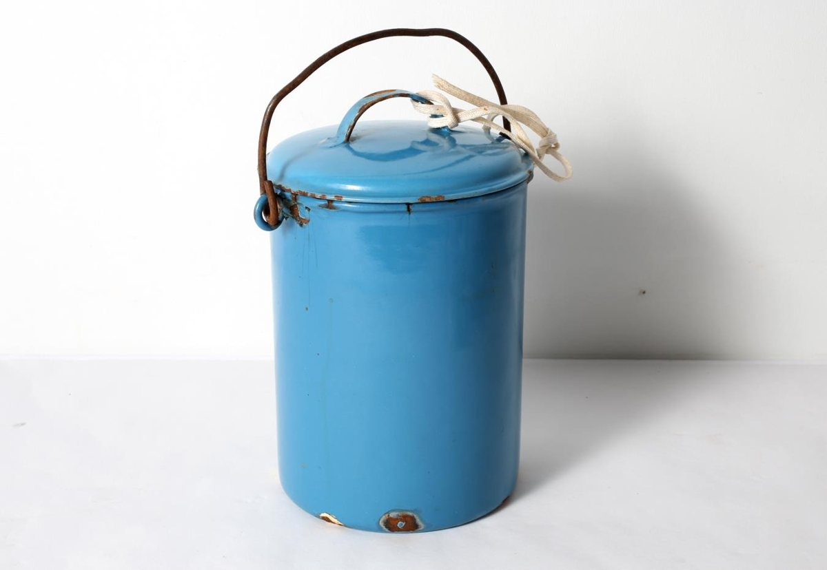 Blá emeleruð spenna með loki. Haldið er ryðgað og mikið dottið upp úr emeleringunni. Spennan er hvít að innan og kemur úr Keldhólabúinu.