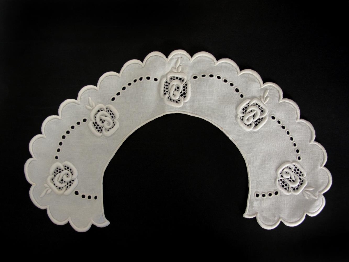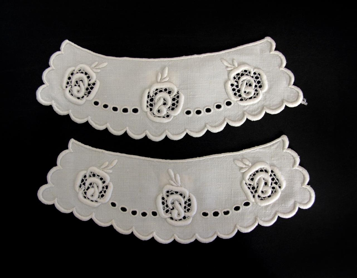 Kragi (a) og tvö uppslög (b), samstæð, saumuð með enskum og frönskum saumi í hvítt léreft. Á kraganum eru fimm rósir og gatamynstur á milli með enskum saumi. Með hliðum og neðri brún kragans eru kappmellaðar tungur. Uppslögin eru með sams konar útsaumi, nema að á hvoru þeirra eru þrjár rósir og þær eru minni en rósirnar á kraganum. Móðir gefanda, Aagot Vilhjálmsson Johansen (f. 1900, d. 1995) saumaði búnaðinn sem hefur átt að vera notaður við kjól. Handbragðið er afar vandað en gripirnir virðast ekki hafa verið notaðir.