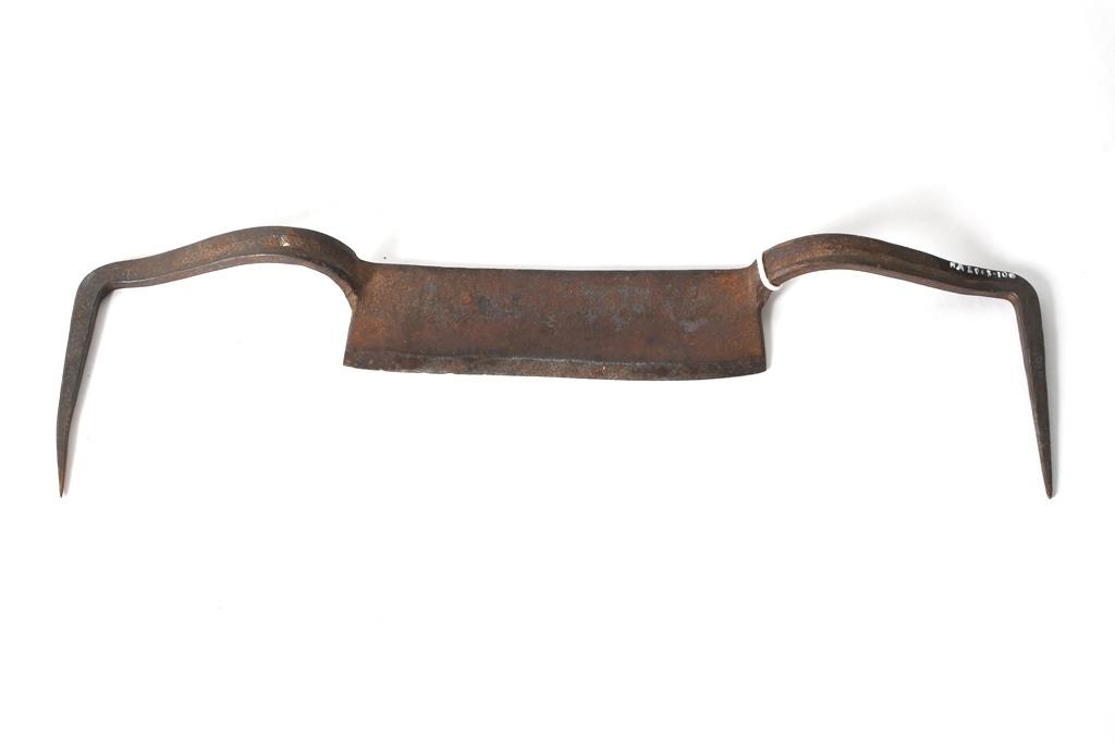 Gamalt hófjárn sem ekki er með neitt á sköftunum, bara oddarnir til að ganga inn í tré eða horn. Járnið kom úr Keldhólabúinu.