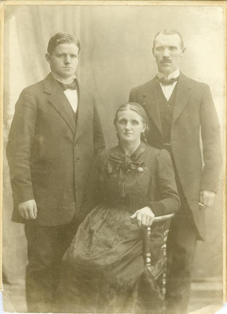 Uppstillt mynd af konu með tveimur sonum sínum standandi fyrir aftan hana.