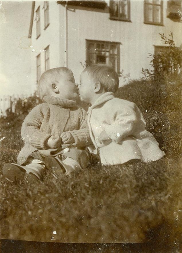 Tvö börn sitja saman í grasi úti við og kyssast. Herdís Vigfúsdóttir hægra megin á myndinni.