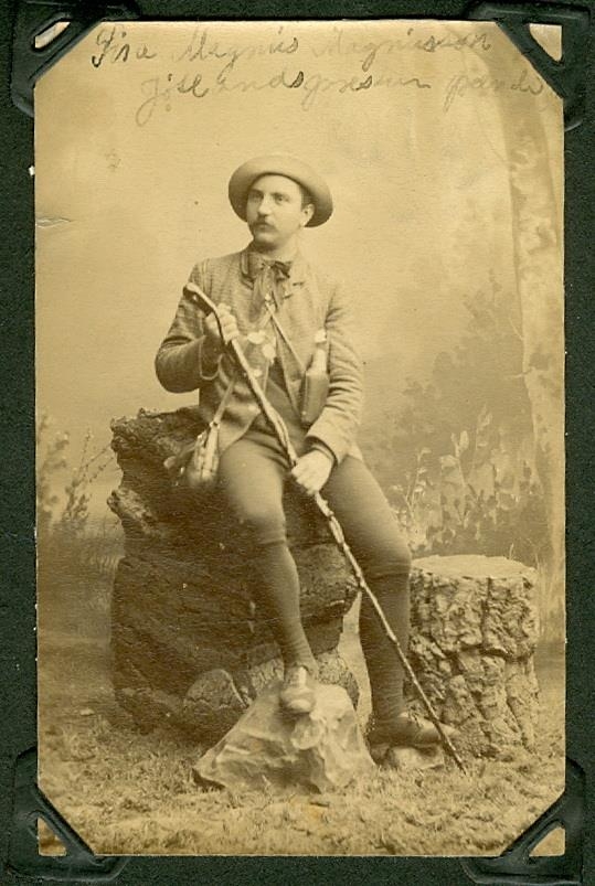 Karlmaður uppstilltur með prik í hendi og hatt á höfði í stúdíómyndatöku.