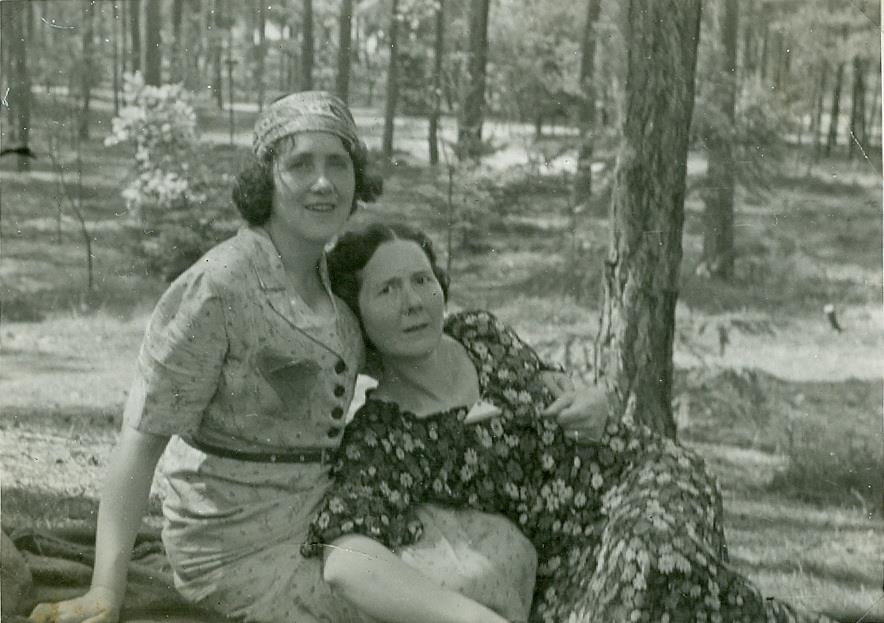 Tvær konur í skóglendi, Aðalbjörg Sigurðardóttir hægra megin og Unnur Thoroddsen vinstra megin.
