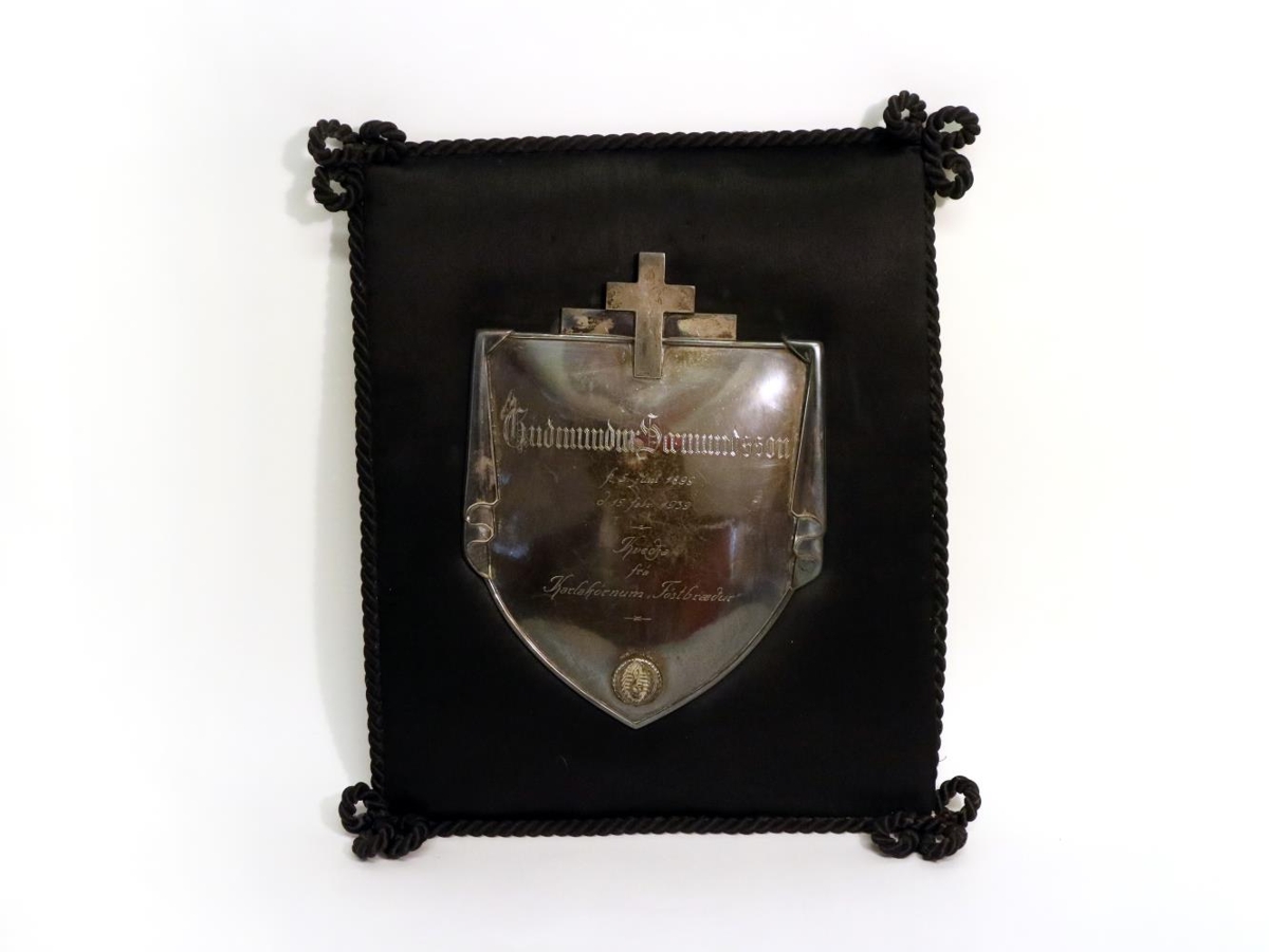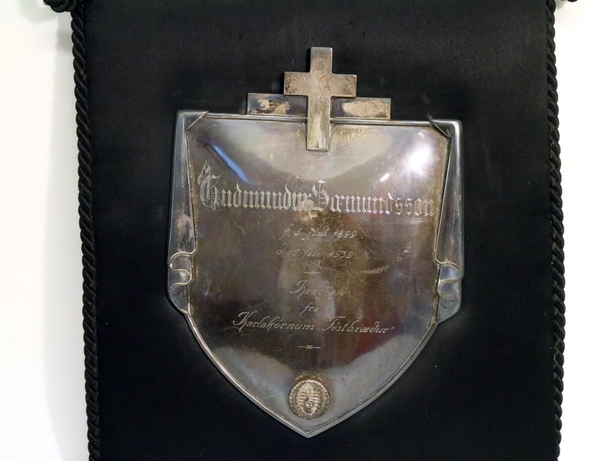 Minningarskjöldur úr silfri, festur á svartan púða sem er bólstraður með svörtu satíni. Skjöldurinn er eilítið kúptur, efst er kross og til hliða eru eins og frádregin tjöld. Umhverfis púðann, sem er ferhyrndur, er snúin snúra. Að aftanverðu er lykkja úr snúnu bandi sem sýnir að skjöldurinn hefur verið hengdur á vegg. Minningarskjöldurinn er um Guðmund Sæmundsson, klæðskerameistara, en hann var föðurafi gefanda. Neðst á skildinum er hringlaga krans og g-lykill. Áletrunin þar fyrir ofan er svo: