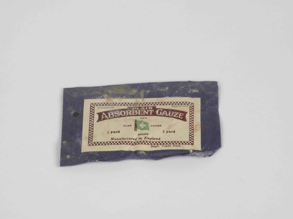 Grisja. Sterilized plain, absorbent Ganze and Flag Cross Brand 1/8 yard , manufactured in England. Áletrun á umbúðir. Fylgdi með NS 5447.