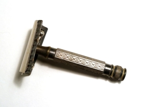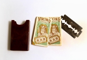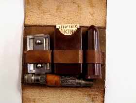 Rakáhöld í brúnu leðurhulstri. Hulstrinu er smellt aftur og í því er rakvél (hausinn er merktur D.R.G.M. og skaftið merkt Ibsen), hvítur sárasteinn (vítissteinn / græðisteinn, til að stöðva blæðingu ef menn skáru sig við raksturinn) í hylki úr brúnu plasti eða bakelít, og í hylki úr sama efni eru tvö ónotuð rakvélablöð af gerðinni VIKING í pappírsumslögum og eitt rakvélablað af gerðinni ROTBART LUXOSA sem virðist vera notað. Í rakvélarhausnum er að auki eitt blað af gerðinni SONNAL GOLD. Miðhluti veskisins er í raun vasi, opinn á einni hliðinni, og þar í er spegill. Áhöldin eru í góðu ástandi. Þau eru að líkindum frá því um eða uppúr miðri tuttugustu öld. Sjá einnig skeggbursta (rakbursta) nr. Þjms. 2015-45-5.
