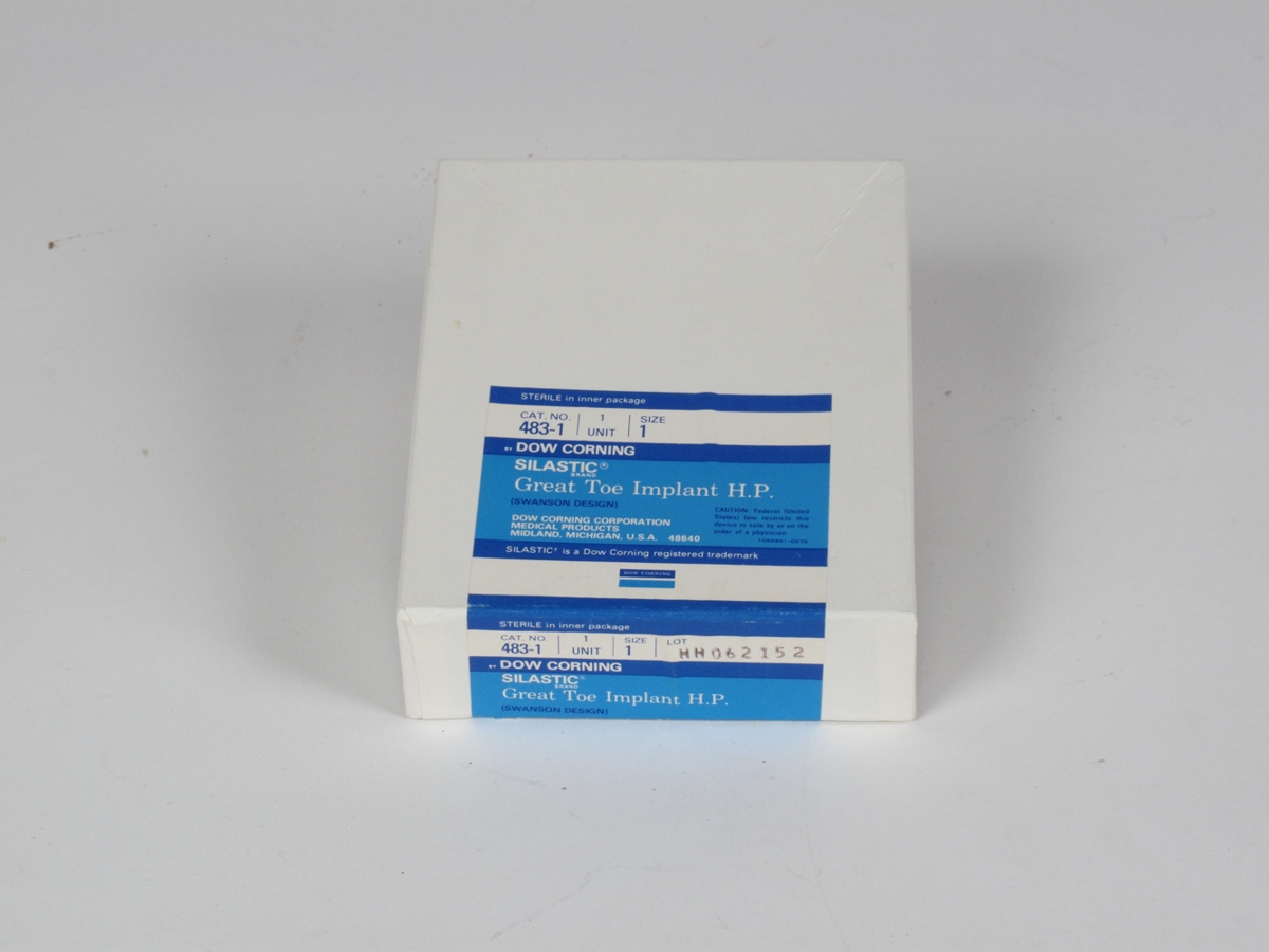 Gerviliður, táaliður. Halldór Baldursson færði safninu eftirtaldar tegundir gerviliða úr eigu Landspítalans: Great toe impiant H. P. Cat no. 483-1. Mál og þyngd: 7