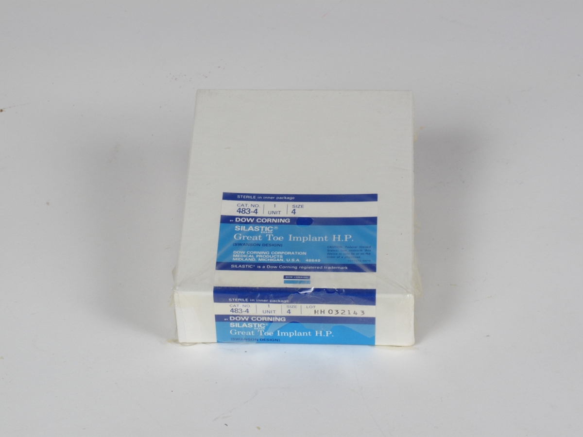Gerviliður, táaliður. Halldór Baldursson færði safninu eftirtaldar tegundir gerviliða úr eigu Landspítalans: Great toe implant Cat no. 483-4. Mál og þyngd: 4