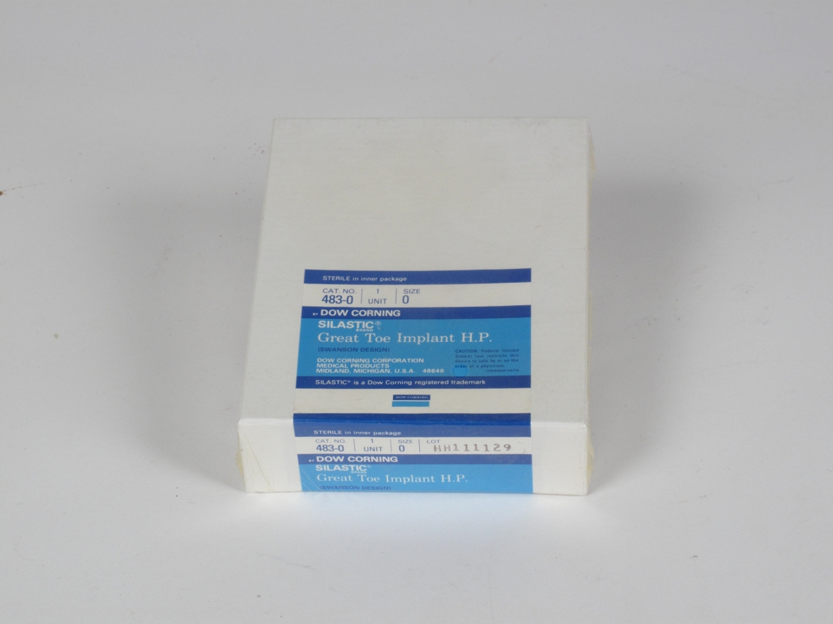 Gerviliður, táaliður. Halldór Baldursson færði safninu eftirtaldar tegundir gerviliða úr eigu Landspítalans: Great Toe implant. Mál og þyngd: 0