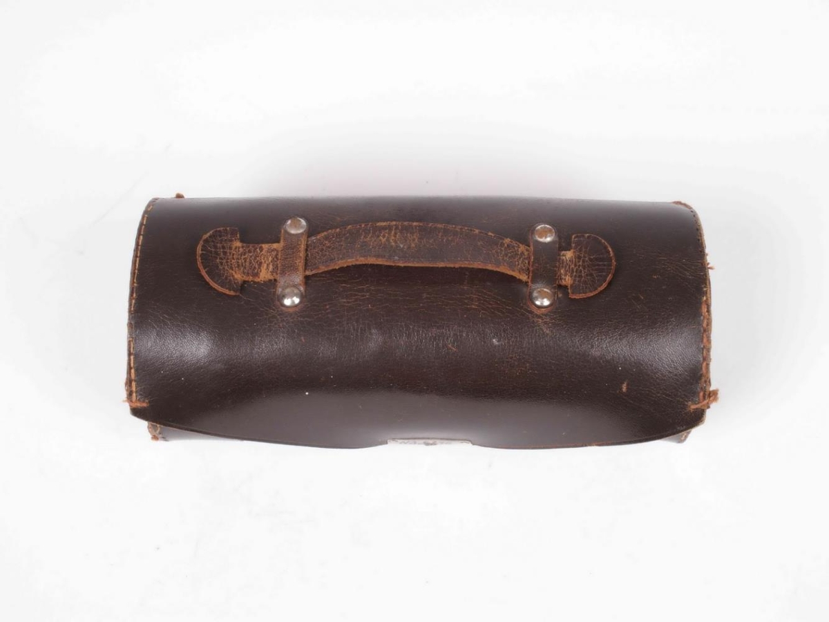 Blóðþrýstingsmælir í leðuröskju. Leðuraskja brún sívalningslaga 18,8 cm löng, með handfangi og málmlæsingu 8,3 cm í þvermál. Armbindi brúnt úr bómull 46 cm langt og snúra. Kvikasilfursmælir og pumpa þvermál 5 cm, 10 cm löng gúmmísnúra 2 x 25 cm. Snúrubútur úr gúmmíi 25 cm, harðnaður.