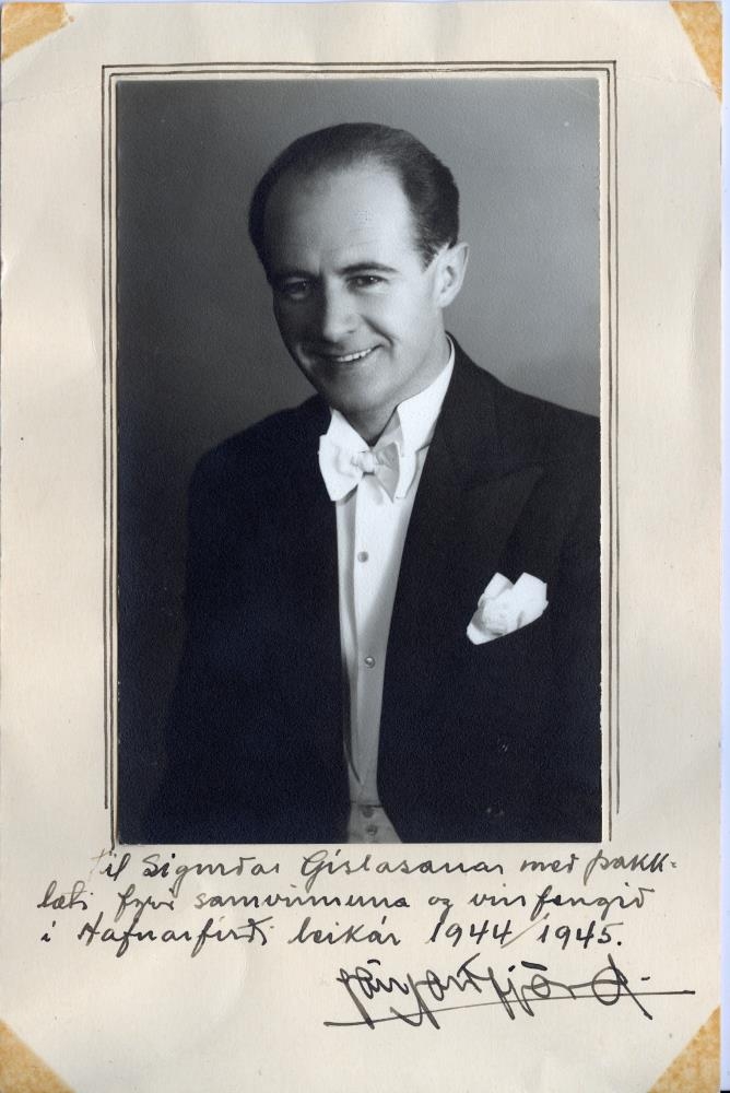 Karlmaður í kjólfötum situr fyrir hjá ljósmyndara. Á myndina er skrifað: Til Sigurðar Gíslasonar með þakklæti fyrir samvinnuna og vinfengið í Hafnarfirði Leikár 1944-1945, Jón Norðfjörð.