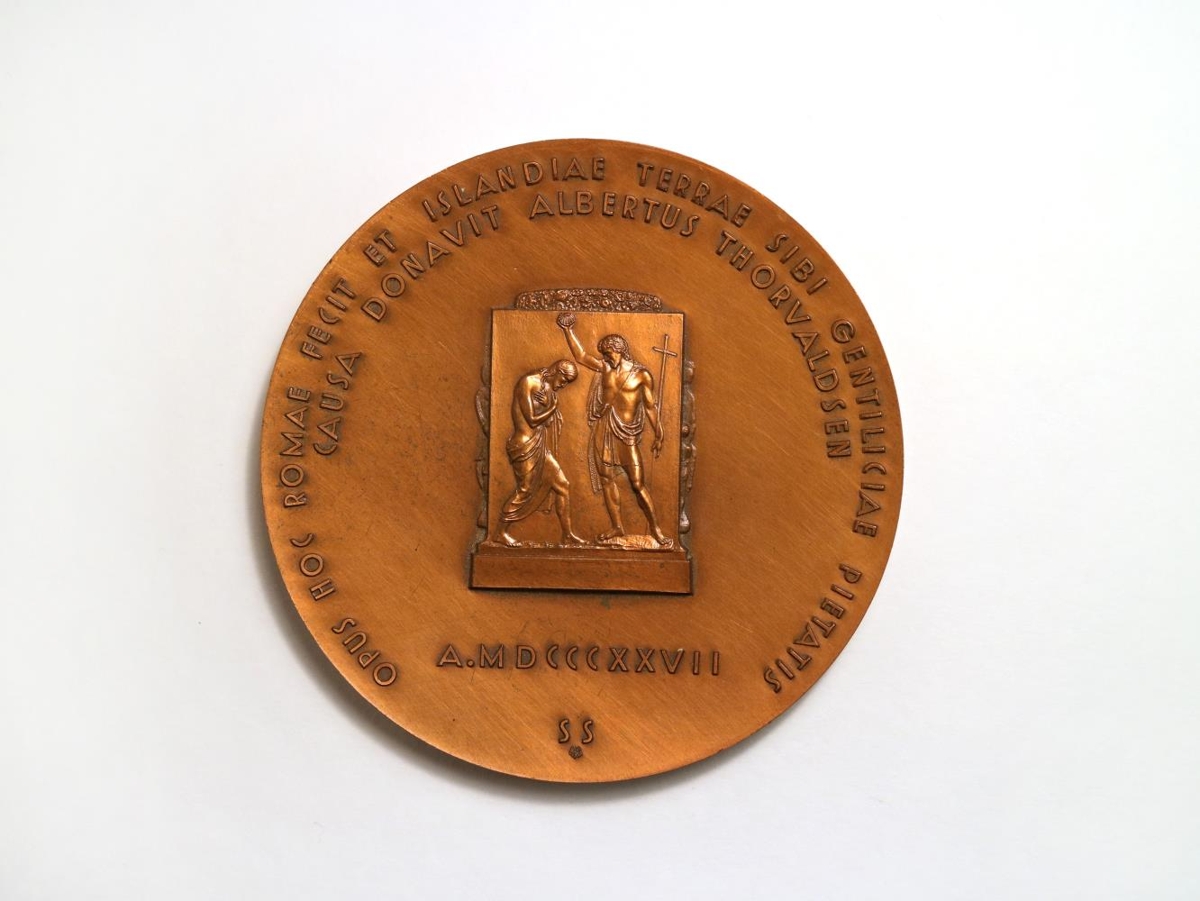 Hin hlið peningsins er eilítið íhvolf. Fyrir miðju er upphleypt mynd er sýnir skírnarfont Dómkirkjunnar í Reykjavík, eða öllu heldur eina hlið hans. Skírnarfonturinn er eftir Bertel Thorvaldsen og þykir mesti dýrgripur kirkjunnar.* Sú hlið fontsins sem sýnd er á minnispeningnum sýnir skírn Krists. Umhverfis myndina er upphleypt áletrun, sem er sú sama og er að finna á annarri hlið skírnarfontsins í Dómkirkjunni: