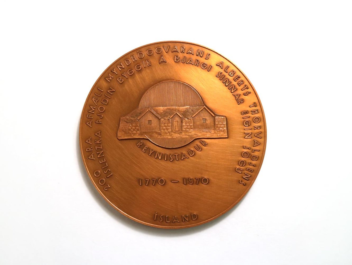 Minnispeningur (minningarpeningur) sem sleginn var í tilefni af 200 ára fæðingarafmæli Bertels Thorvaldsen (Karls Alberts Thorvaldsens). Peningurinn er úr koparblöndu. Hann er stór, rúmir 9 cm í þvermál og 0,8 cm á þykkt. Á annarri hliðini er upphleypt mynd af sveitabæ, Reynistað í Skagafirði. Þrátt fyrir að Bertel hafi fæðst og alist upp í Danmörku, tengja Íslendingar hann við Reynistað því þaðan var faðir Bertels, Gottskálk Þorvaldsson, ættaður. Með brúnunum er upphleypt áletrun: