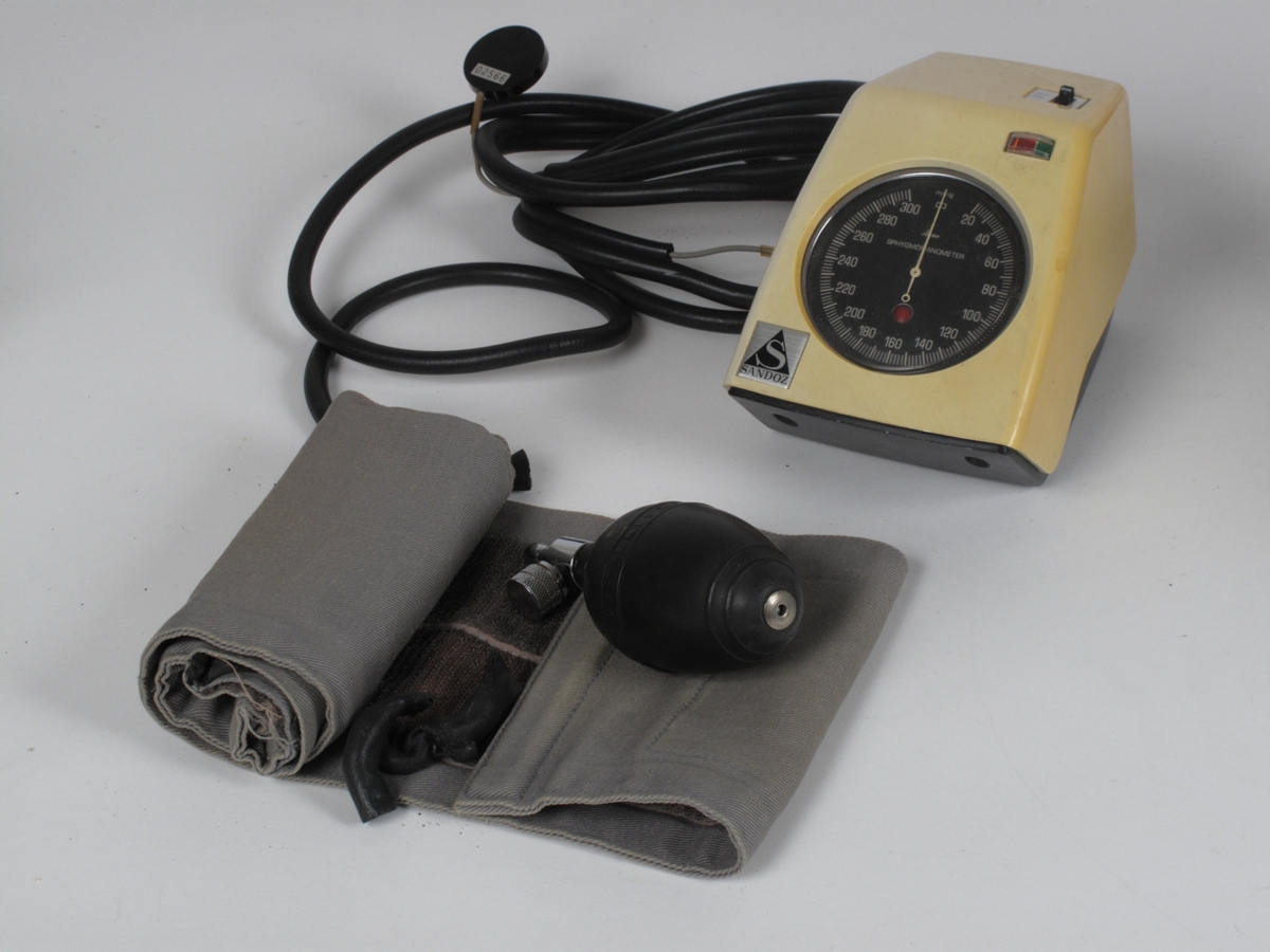 Blóðþrýstingsmælir. Mælirinn sjálfur er úr plasti, úr honum liggur slanga sem á er pumpa. Við enda slöngunnar er efnisbútur sem vafinn er um handlegg.